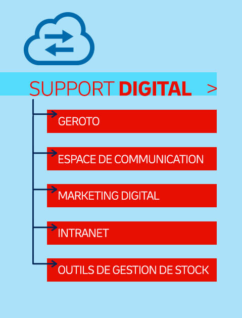 MARKETING DIGITALl : Accompagnement des clients adhérents dans la digitalisation de leur activité. Cela commence par la mise en ligne de site internet propre pour le membre, puis l’animation et de ses réseaux sociaux, en passant par le développement du e-commerce.